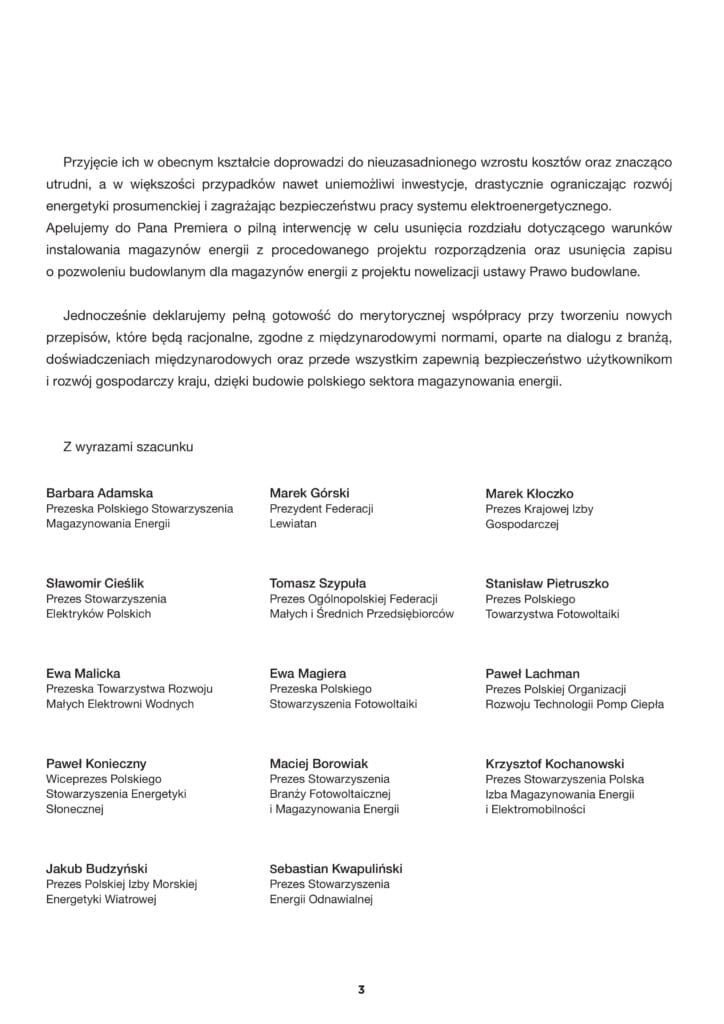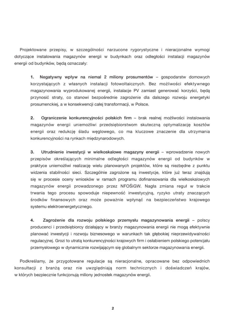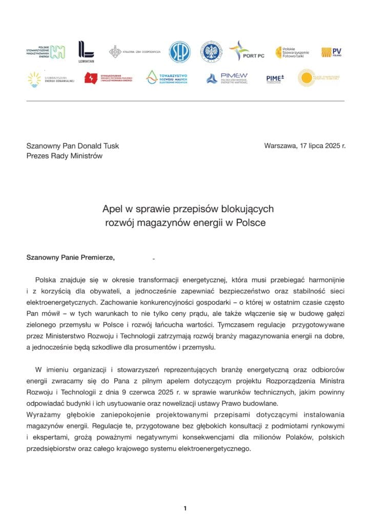 Stowarzyszenie Polska Izba Magazynowania Energii i Elektromobilności – PIME oraz 14 innych organizacji gospodarczych w tym z branży OZE i magazynowania energii przesłało 17 lipca Apel do Premiera RP Donalda Tuska. Apel dotyczy przepisów blokujących rozwój magazynów energii elektrycznej w Polsce, a w szczególności projektu Rozporządzenia Ministra Rozwoju i Technologii z dnia 9 czerwca 2025 r. w sprawie warunków technicznych, jakim powinny odpowiadać budynki i ich usytuowanie oraz nowelizacji ustawy Prawo budowlane. Zdaniem branży projekt tych regulacji jest szkodliwy dla gospodarki kraju i transformacji energetycznej, która ma wykorzystać w pełni potencjał technologii magazynowania energii elektrycznej. Projektodawca zamierza wprowadzić restrykcyjne wymogi budowy dla magazynów energii elektrycznej, których pojemność jest większa niż 20kWh. Eksperci wyraźnie podkreślają, że przyjęcie tych przepisów wstrzyma inwestycje w tym sektorze na wiele lat. Eksperci podkreślają też, że nieuwzględnienie głosu branży przy tworzeniu przepisów dotyczących bezpieczeństwa technologii magazynowania energii elektrycznej jest niedopuszczalne i niezrozumiałe w państwie prawa. – Proponowane przepisy godzą przede wszystkim w małe i średnie przedsiębiorstwa, które są największym płatnikiem PKB w Polsce a magazyny energii miały pomóc im ograniczyć koszty energetyczne, które dla tej grupy taryfowej są najwyższe – wskazuje Krzysztof Kochanowski, Prezes PIME. Podkreśla także niekonsekwencję w proponowanych regulacjach prawnych. – Przykład samochody elektryczne. Niektóre samochody mają baterie nawet przekraczające 20 kWh pojemności i są to przede wszystkim baterie w technologii NMC, które są bardziej niebezpieczne niż baterie w technologii LFP, które używane są wyłącznie w magazynach energii. Samochody elektryczne nie mają tak zaostrzonych przepisów i samochód można trzymać w garażu w budynku. Podobnie widzimy nieadekwatność przepisów ppoż. np. dla wielkoskalowych PV czy wiatraków, które są dużo łagodniejsze. Brakuje też w projekcie rozporządzenia odniesienia się do przepisów i norm światowych w tym zakresie. Odnosimy wrażenie, że lobby budowlane i straży pożarnej zastosowało przepisy budowlane tożsame jakie obowiązują dla baterii w technologii kwasowo-ołowiowej. A więc autorzy regulacji nie odrobili lekcji na temat technologii litowo-jonowej. Stopień zabezpieczeń przeciwpożarowych w litowo-jonowych bateryjnych stosowanych w magazynach energii jest porównywalny z zabezpieczeniami w technologiach kosmicznych, czyli bardzo restrykcyjny i zaawansowany technicznie – wyjaśnia Krzysztof Kochanowski.