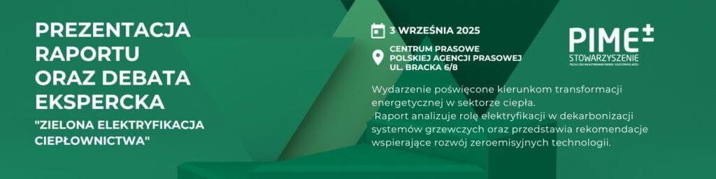 PREZENTACJA RAPORTU „Zielona elektryfikacja ciepłownictwa” ORAZ DEBATA EKSPERCKA Zapraszamy na debatę ekspercką poświęconą zielonej elektryfikacji ciepłownictwa, która odbędzie się 3 września 2025 o godz. 14:00 w Centrum Prasowym PAP w Warszawie. W programie prezentacja raportu „Zielona Elektryfikacja Ciepłownictwa” przygotowanego przez Instytut Energetyki Odnawialnej oraz dyskusja z udziałem przedstawicieli administracji, biznesu i kluczowych organizacji branżowych. To […]